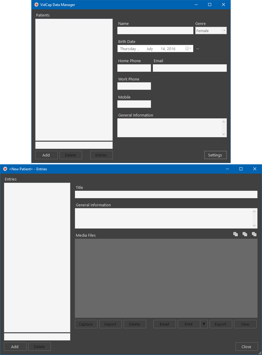 VidCap offers a fully featured application to help you keep your captured media organized with your patients data records. It also makes it extremely easy to share, export and print reports of all the captured images and videos.